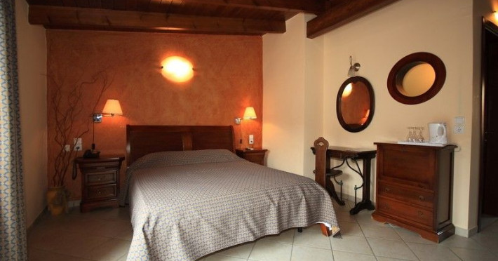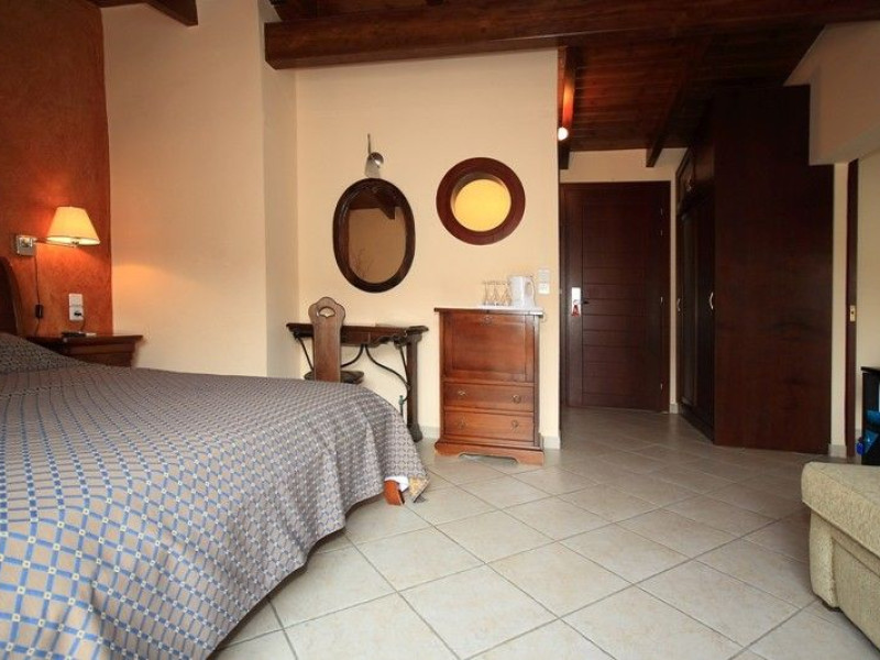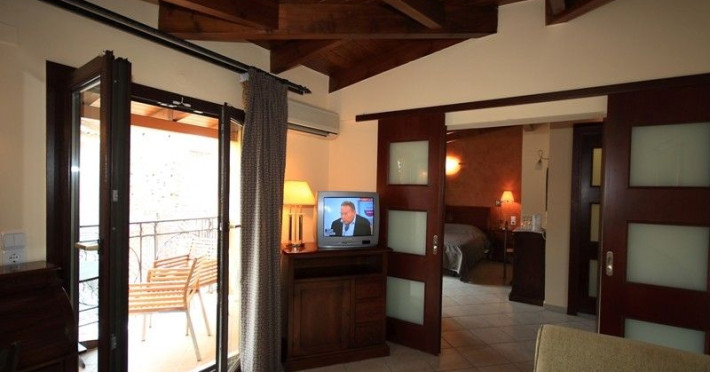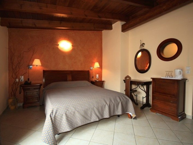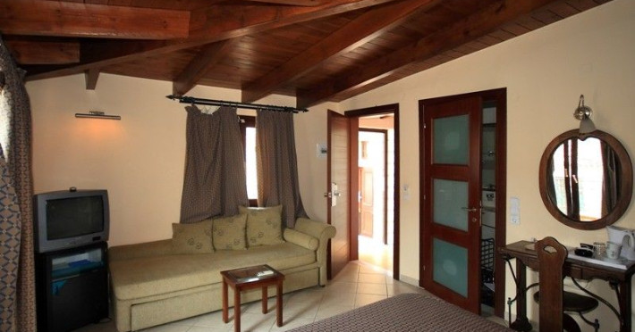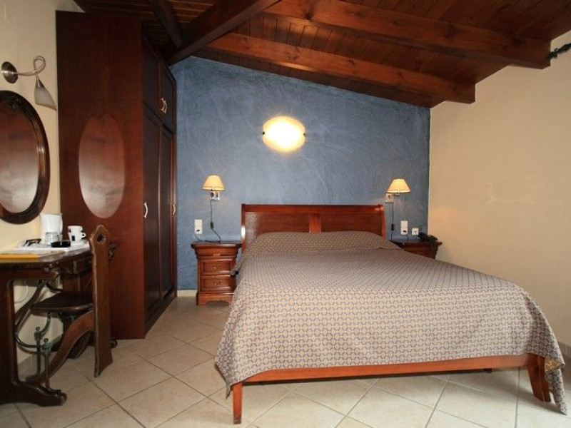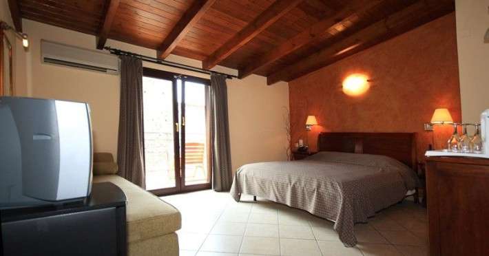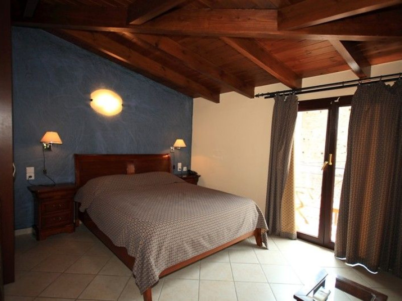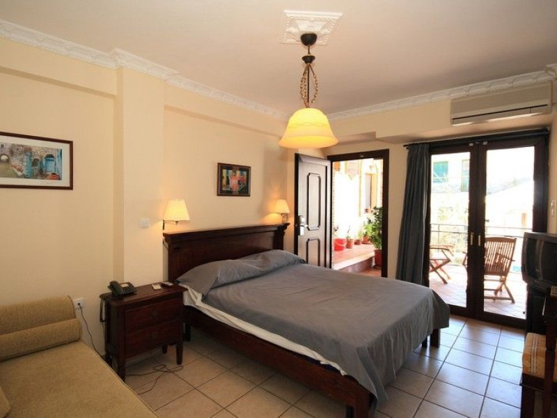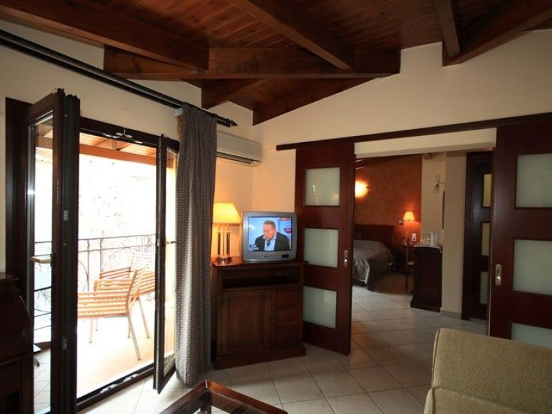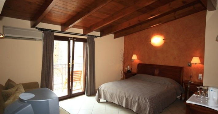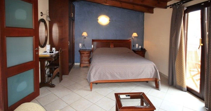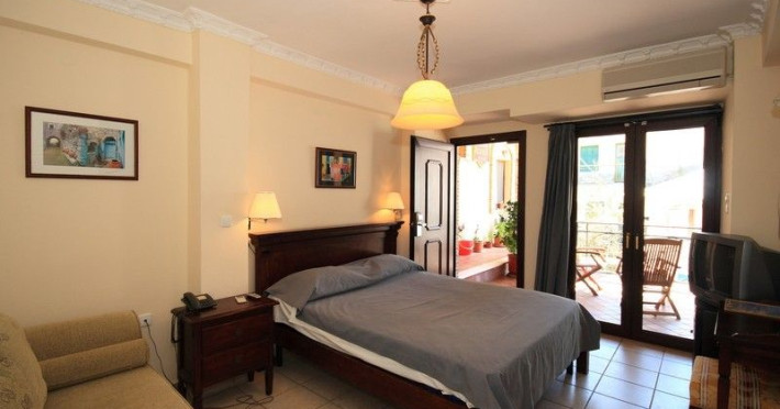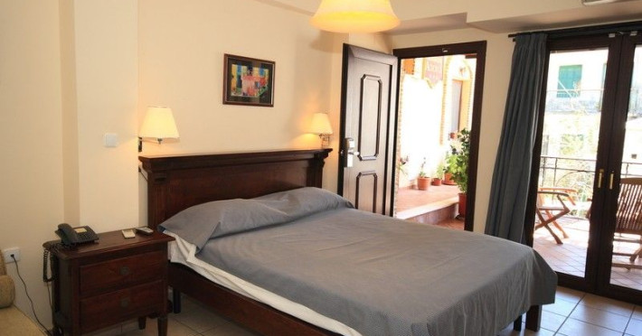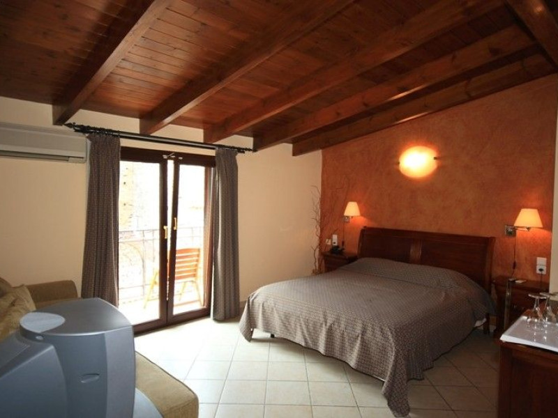 The rooms are decorated in cool shades of cream and white which blend harmoniously with the chocolate brown wood of the handmade furniture imported from Pisa in Italy. Luxury has not been neglected in any way, from the hydro-massaging shower rooms to the air-conditioning. Each room has a balcony, with comfortable wooden furniture, which either looks out to the Castello terrace or the street below and some offer partial views of the 14th century Venetian castle above the town.