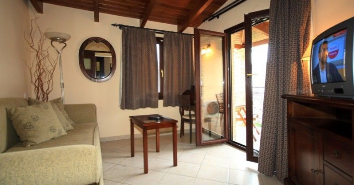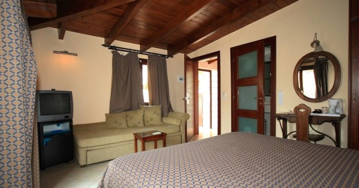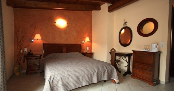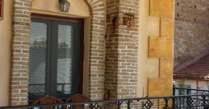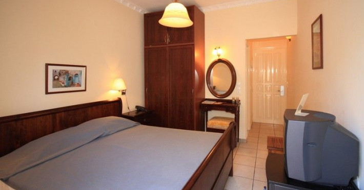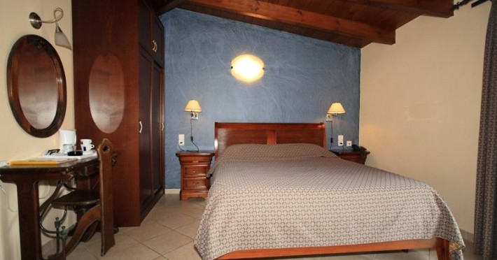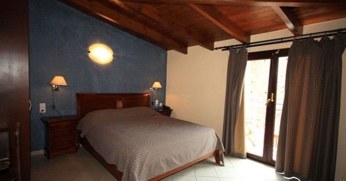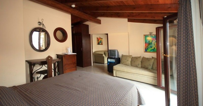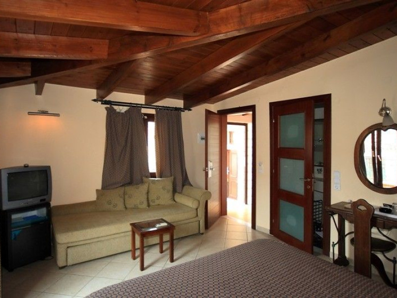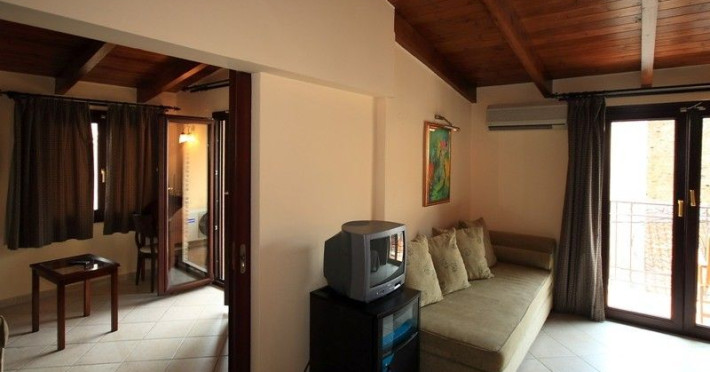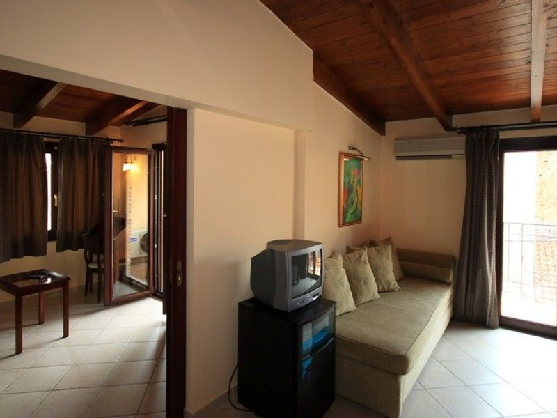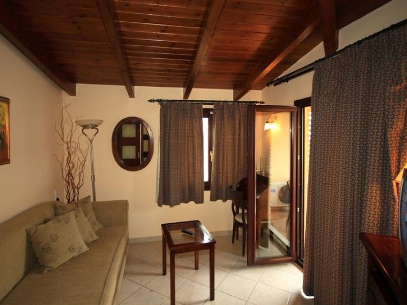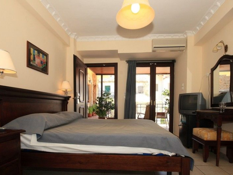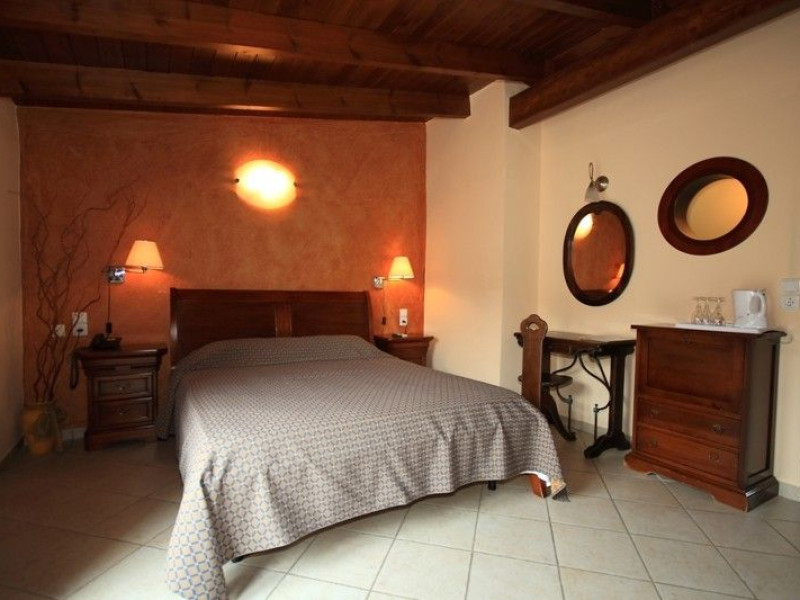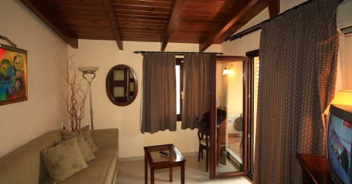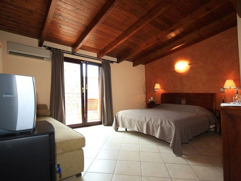 The rooms are decorated in cool shades of cream and white which blend harmoniously with the chocolate brown wood of the handmade furniture imported from Pisa in Italy. Luxury has not been neglected in any way, from the hydro-massaging shower rooms to the air-conditioning. Each room has a balcony, with comfortable wooden furniture, which either looks out to the Castello terrace or the street below and some offer partial views of the 14th century Venetian castle above the town.
