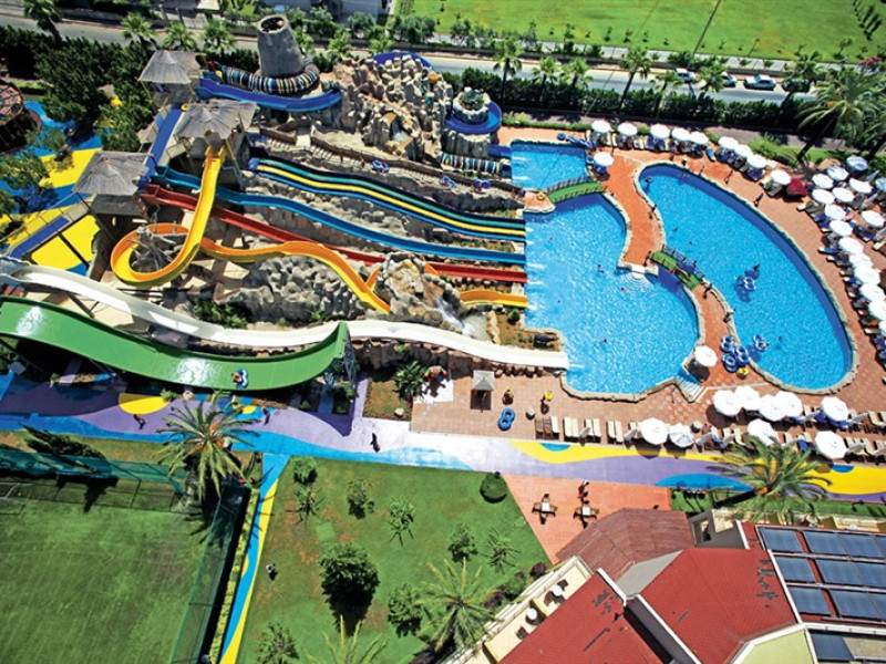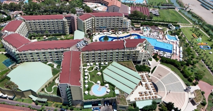 Facilitati hotel: Acest hotel de 5* ofera :restaurant principal Harmony, 5 restaurante A la Carte , 14 piscine: 5 pentru copii, piscina exterioara semi-olimpica (1600 mp), aquapark, 2 piscine naturale ,piscina cu tobogan acvatic , terasa cu piscina, piscina interioara , piscina Thalasso ,mini-club , biliard, animatie, jocuri, spectacole, aerobic,minge de apa, tenis de masa, 6 terenuri de tenis, 2 terenuri de fotbal (cu iarba naturala si artificiala), volei pe plaja, baschet, darts, mini-golf, boccia, cafenea, badminton, sala de fitness, baie turceasca, sauna.