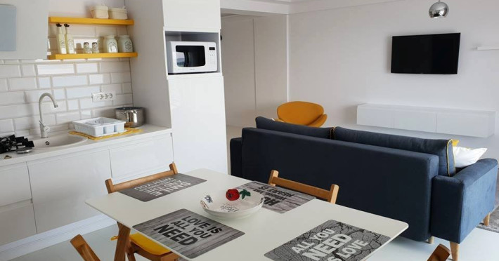 Toate apartamentele au bucatarie de tip open space, complet mobilata si utilata (frigider, plita pe gaz, cuptor cu microunde, espressor de cafea cu cafea boabe, vesela, tacamuri). Toate apartamentele au aer conditionat, TV LED cu conexiune cablu TV, acces Internet Wi-Fi gratuit, suport uscator de rufe, masa de calcat si fier de calcat, uscator de par, mobilier pe balcoane/ terase.